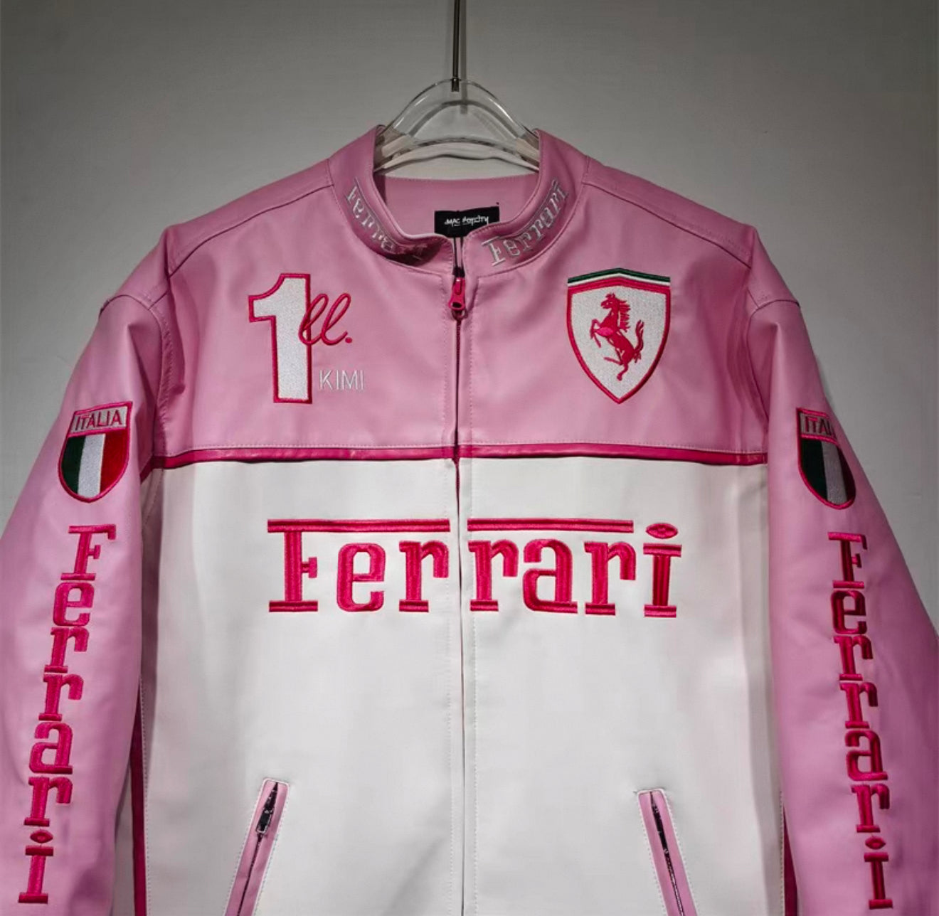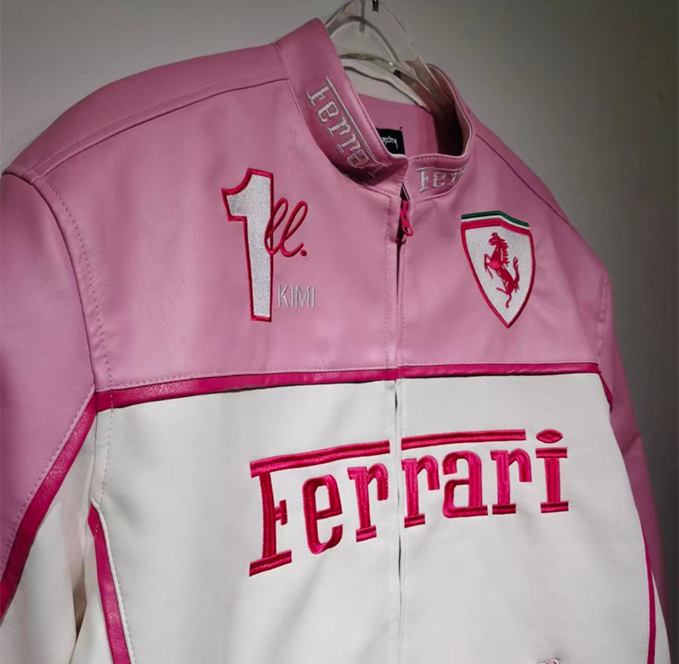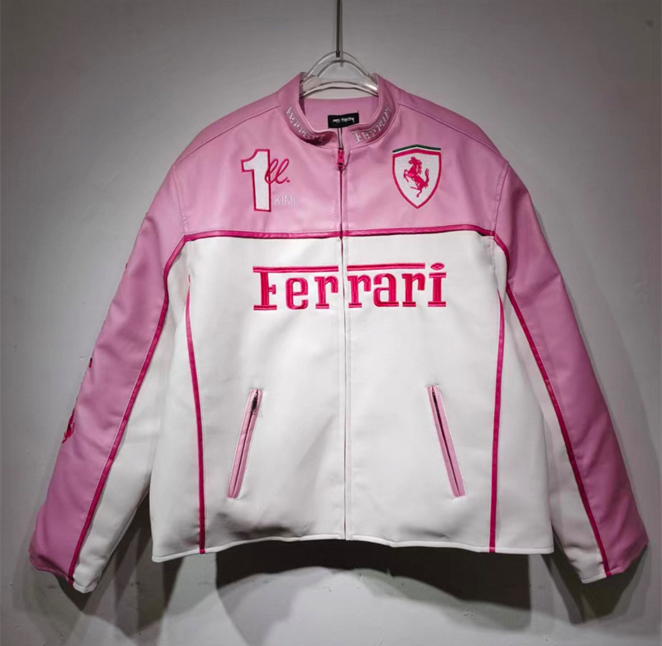 Ferrari Pink & White Leather Jacket – Kimi #1 Edition Racing Style